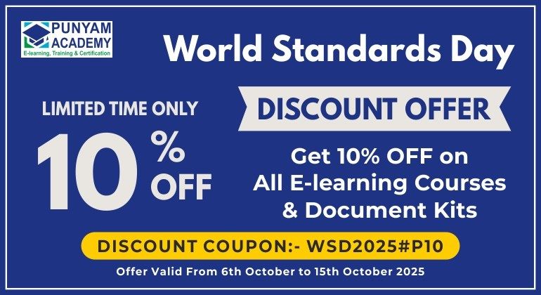 LOS ANGELES, CA, October 07, 2025 /24-7PressRelease/ -- Punyam Academy Pvt. Ltd., a leading name in ISO certification training and consulting, is excited to announce a limited-time offer of a 10% discount on all its products in celebration of World Standards Day, from October 6th to 15th, 2025. This special promotion aims to help professionals and organizations improve their knowledge and skills in ISO standards and management systems.